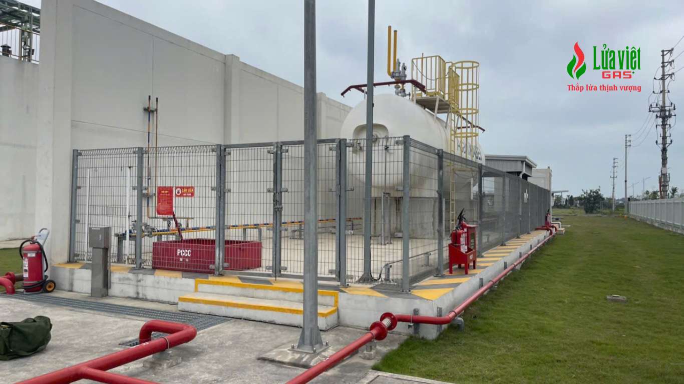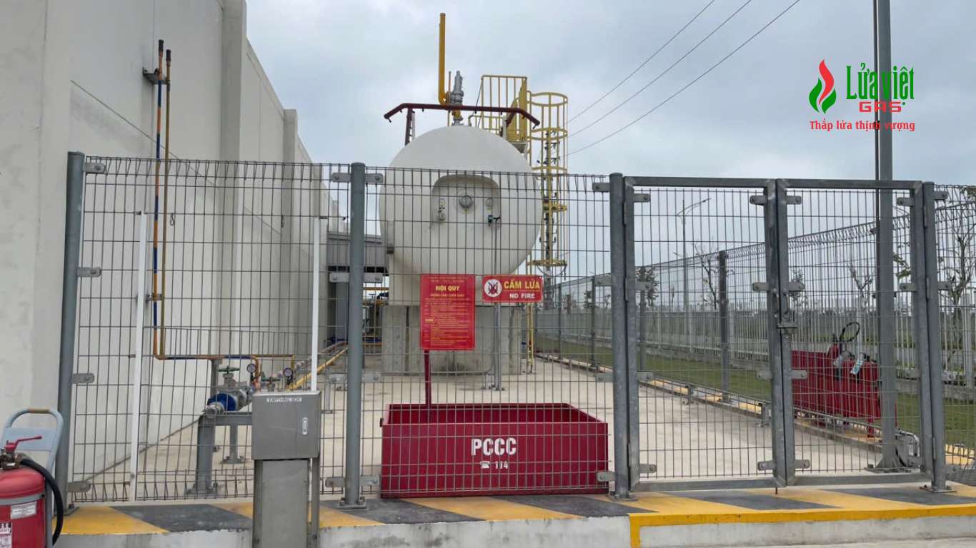 • 03 bồn gas công nghiệp dung tích 3.2 tấn: Được bố trí tại khu kỹ thuật riêng biệt, tuân thủ nghiêm ngặt quy định về khoảng cách PCCC.