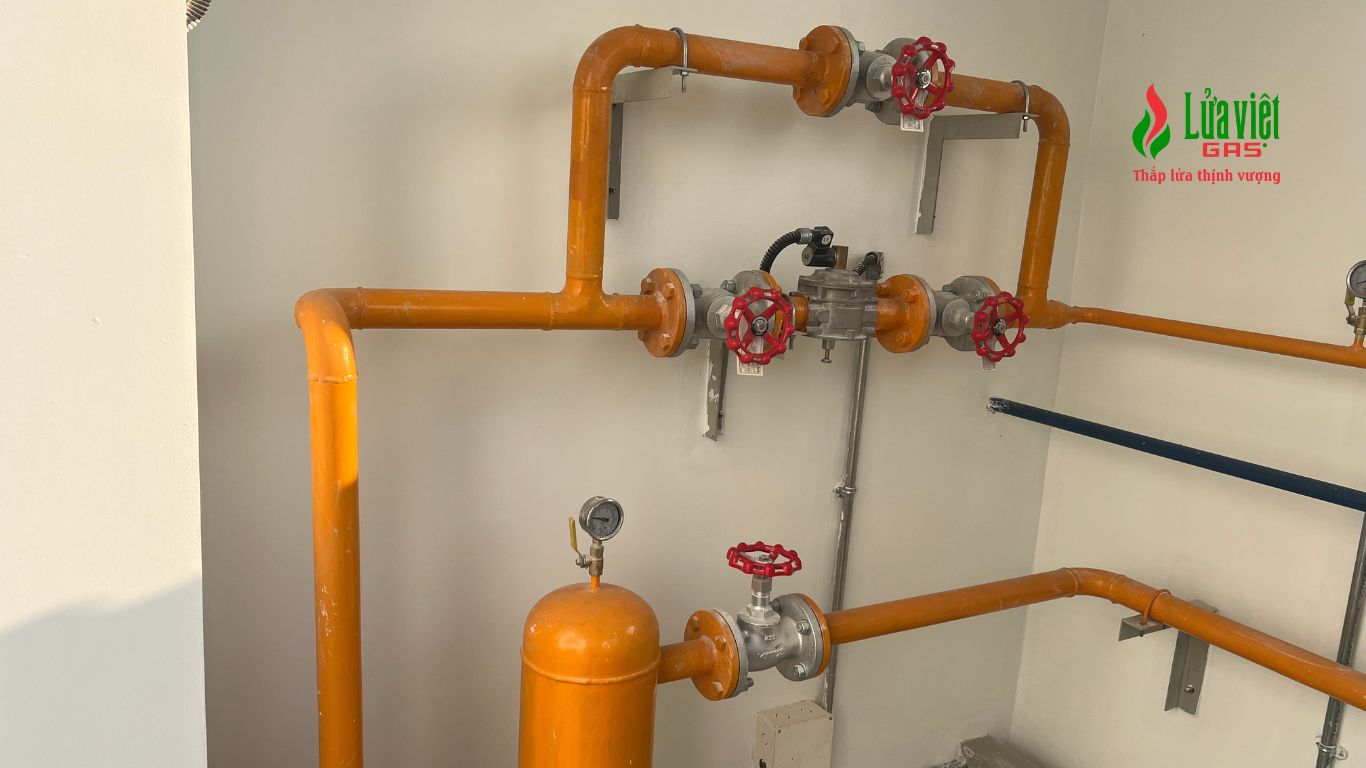 Đường ống dẫn gas thép mạ kẽm, sơn chống oxy hóa, đi nổi và âm tùy khu vực, đảm bảo thẩm mỹ và an toàn.